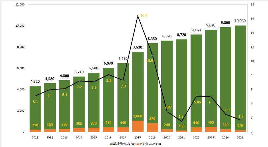 최저임금은 근로자가 최소한으로 받아야 하는 임금을 의미하며, 이는 노동자의 생활을 보장하고 경제적 불평등을 줄이기 위한 중요한 제도입니다. 최저임금이 정해지면, 많은 근로자들이 그 기준에 따라 임금을 받게 되므로, 사회 전반에 걸쳐 큰 영향을 미칩니다. 최저임금 제도는 1953년에 근로기준법을 제정하면서 제34조와 제35조에 최저임금제의 실시 근거를 두었으나, 당시 우리 경제가 최저임금제를 수용하기 어렵다는 판단에 따라 이 규정을 운용하지 않았습니다. 저임금의 제도적인 해소와 근로자에 대하여 일정한 수준 이상의 안정된 생활을 보장해 주기 위하여 최저임금제의 도입이 불가피해졌고, 우리 경제도 이 제도를 충분히 수용할 수 있는 수준에 도달하였다고 판단 1986년 12월 31일 최저임금법을 제정.공포하고 1988년 1월 1일부터 실시하게 되었습니다. 이후 여러 차례의 인상을 거쳐 현재에 이르렀습니다. 2010년대 들어서는 최저임금 인상이 사회적 이슈로 떠오르며, 매년 논의가 활발히 이루어지고 있습니다. 특히 2018년에는 16.4%라는 높은 인상률을 기록하며, 최저임금이 6,470원에서 7,530원으로 1,060원이 인상되었습니다. 2025년도는 여러가지 의미중 1만원의 돌파한 첫 사례로 10,030원이 되었으며, 이러한 변화는 많은 근로자들에게 긍정적인 영향을 미쳤지만, 동시에 경영자들 사이에서는 부담으로 작용하기도 했습니다. 최저임금 현황에 대해 조금더 알고 싶으시면 아래 링크를 통해 알아보실수 있으니 참조바랍니다.