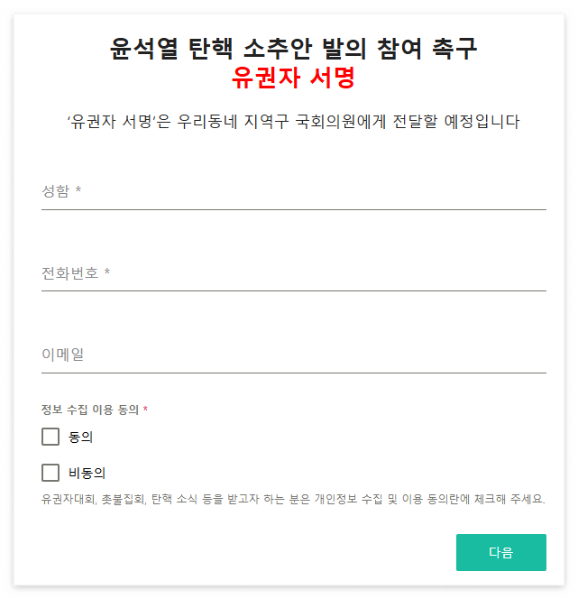 3. 윤석열 탄핵 유권자 서명의 취지를 확인 후 다음을 선택합니다.