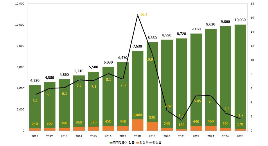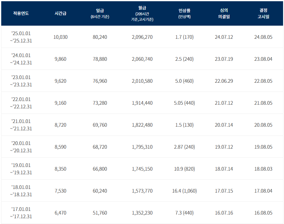 2025년 최저임금이 결정되었습니다. 시급이 처음으로 1만원을 돌파 하였으며, 매년 최저임금 문제는 사용자인 경영계와 근로자인 노동계 사이에서 상당한 논쟁을 불러일으키고 있습니다. 1만원이 돌파된 2025년 최저임금인 시급은 10,030원이며, 일급은 80,240원, 월급은 2,096,270원 입니다. 2025년 최저임금에 좀더 알아보도록 하겠으며, 현재 나의 최저임금이 미달이 되는지 계산을 하고 싶으시다면 고용노동부 홈페이지를 접속하시거나 아래 링크를 통해 빠르게 접속 하실수가 있으니 참조바랍니다.