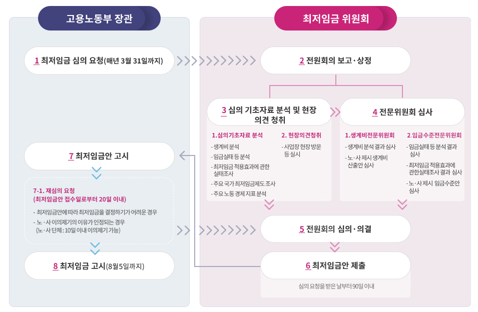 7-1. 최저임금법 제8조 제3항에 따라 위원회가 제출한 최저임금안에 따라 최저임금을 결정하기가 어렵다고 인정되거나 법 제9조에 따라 근로자를 대표하는 자 또는 사용자를 대표하는 자가 최저임금안이 고시된 날로부터 10일 이내에 장관에게 이의를 제기하고 그 이유가 있다고 인정되는 경우, 장관은 20일 이내에 그 이유를 밝혀 위원회에 10일 이상의 기간을 정하여 재심의 요청
